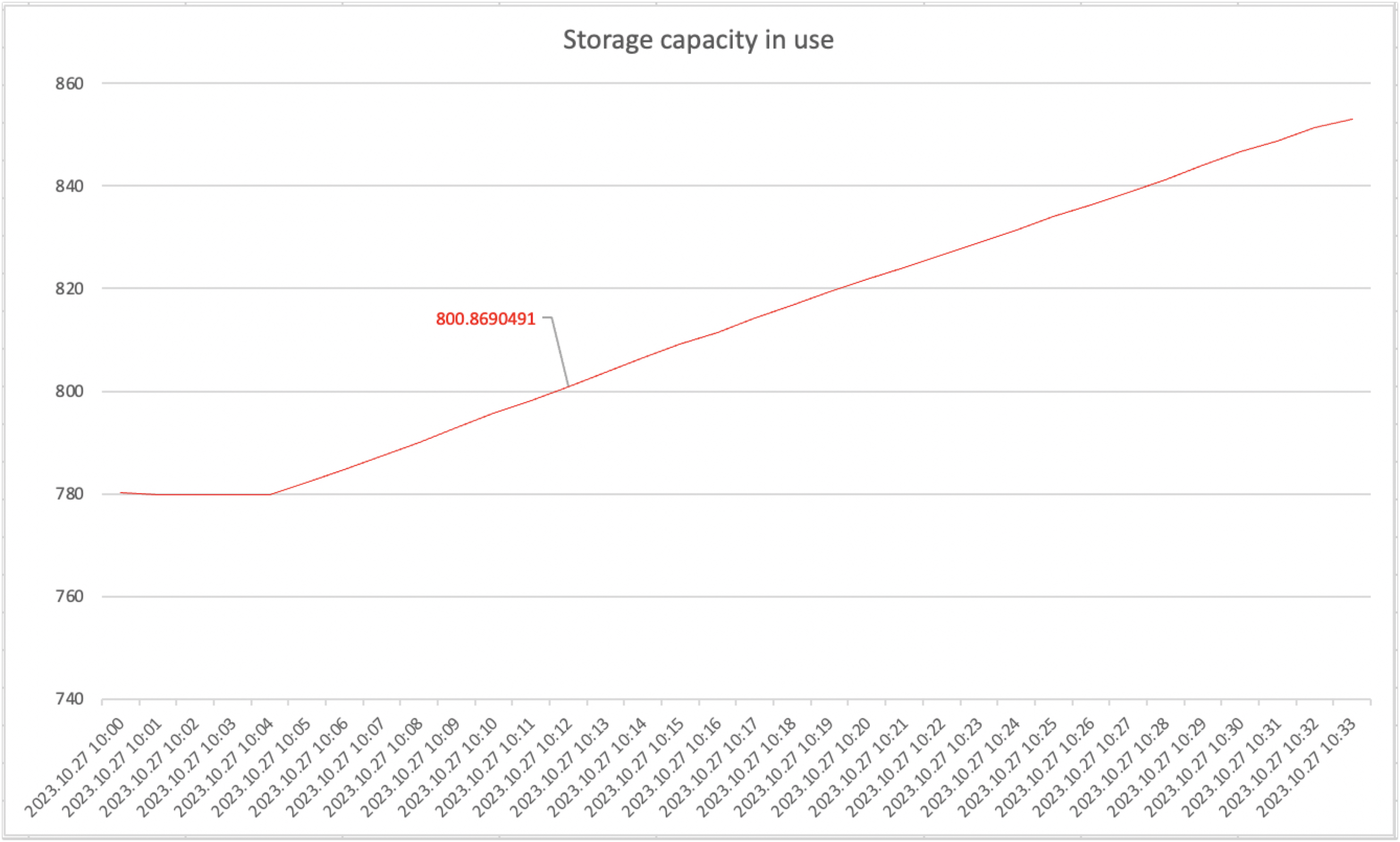 사용 중인 스토리지 용량이 800GB를 넘은 그래프